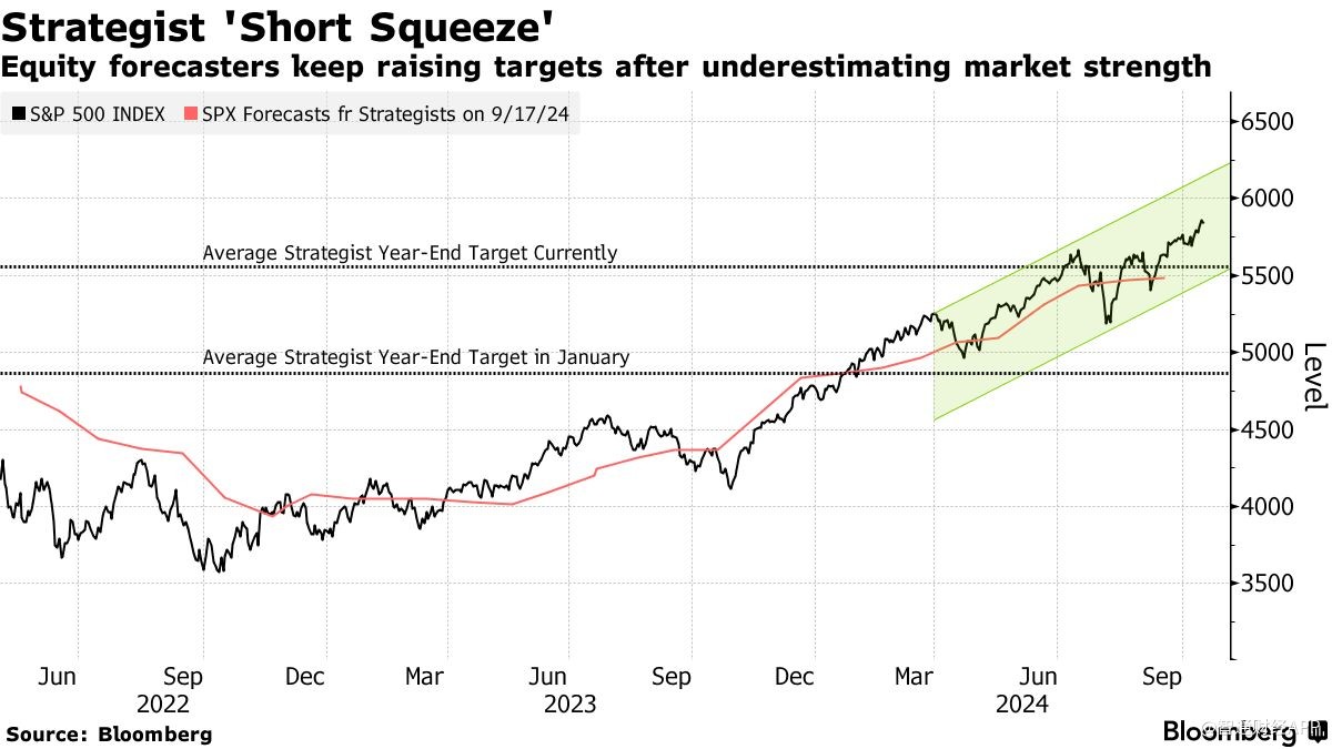 涨幅之大促使华尔街预测者争先恐后地提高对2024年最后一段时间的预测——即所谓的“策略师空头挤压”,类似于股价快速上涨迫使交易员平仓看跌押注的情况。去年标普500指数上涨24%也让策略师们措手不及。
