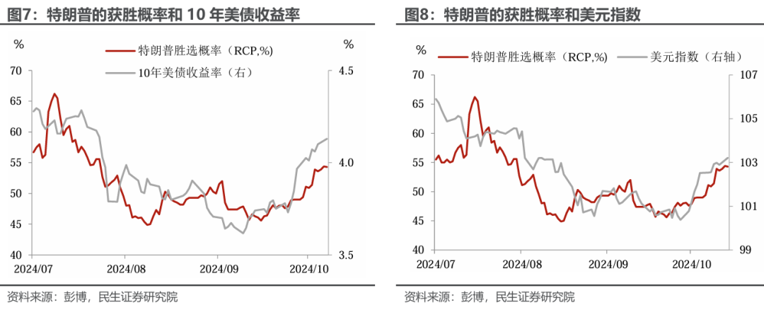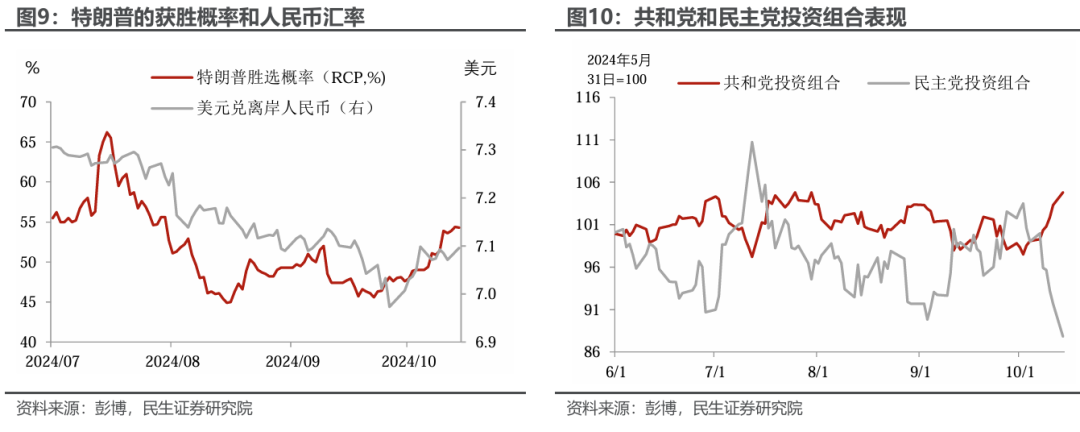 “特朗普交易”在金融市场上的交易已经开始显现。10月以来随着特朗普支持率的不断上升、甚至扭转,美元指数已经升值到103以上,10年期美债收益率也上升至4%以上。此外,尽管有国内稳经济政策的转向,离岸人民币汇率依旧跌破了7.10。