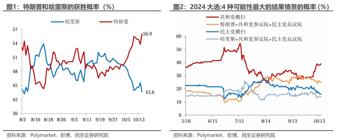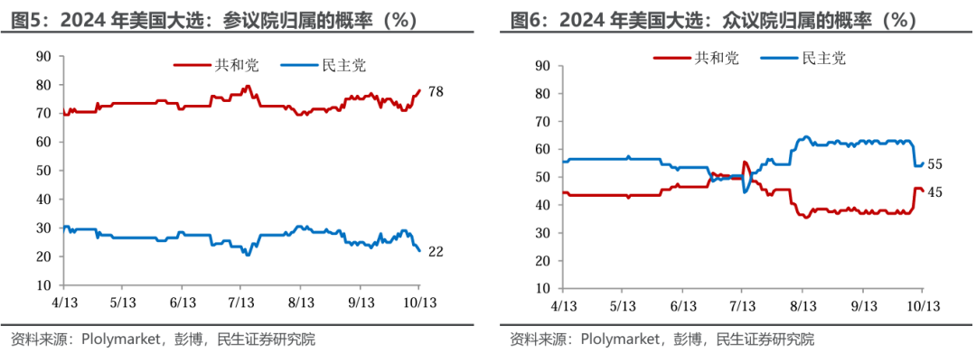 “共和党横扫”情景的概率上升,提高特朗普的政策提案的落地概率。参议院几乎已被共和党“预订”,众议院选举中目前民主党领先,但共和党正在缩小差距。