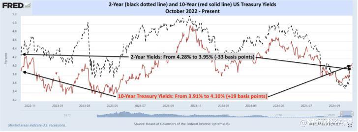 DataTrek的联合创始人Nicholas Colas在一份报告中指出:“利率几乎与两年前持平,这与大多数‘早期周期’的牛市不同,通常此时利率会下调。”他提到,过去两年中2年期和10年期美国国债收益率有所波动,但最终回到了最初的水平。Colas特别提到了从2022年10月12日到2024年10月14日期间的国债收益率走势,这正是本轮股市牛市两周年的时段。