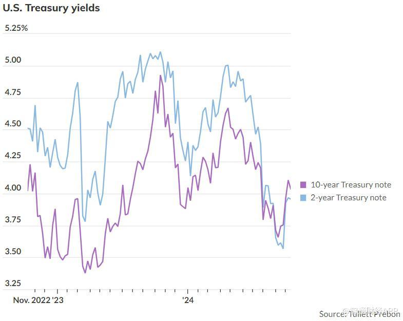 周二,2年期美国国债收益率微涨至3.955%,而10年期国债收益率则降至4.037%。同日,美国股市收低,道琼斯工业平均指数和标普500指数分别下跌近0.8%,纳斯达克综合指数则下跌超1%。