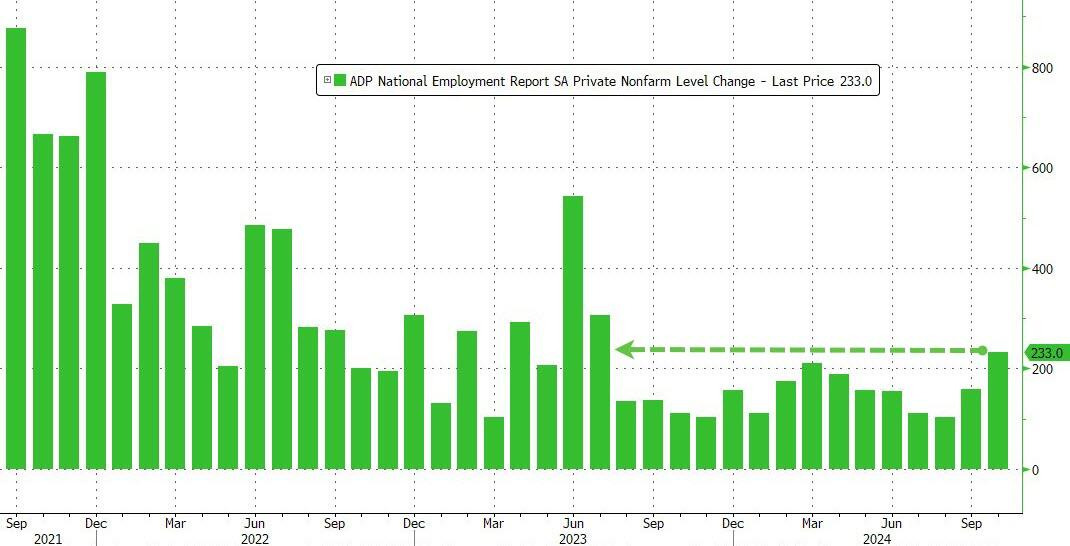 美国自动数据处理公司(ADP)公布的数据显示,美国10月ADP就业人数增加了23.3万人,为2023年7月以来最大增幅,远超预期的11.4万人,9月份的数据也由14.3万人上调至15.9万人。