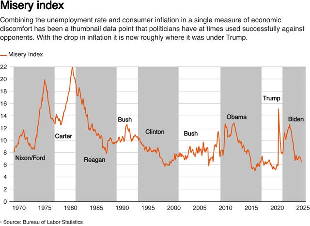 把失业率和通货膨胀率结合起来,概括地描述经济问题,一直被政客们用作打击对手的一种方式,尤其是在高通胀时期。随着通货膨胀率的下降,“痛苦指数”大致回到了特朗普上任前的大部分时间里的水平。