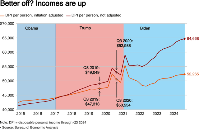 不过,尽管这一过程中的颠簸是巨大的,因为联邦支出在一段时间内提高了收入,然后价格上涨降低了购买力,但截至今年第三季度,经通胀调整后的人均收入比2019年第三季度高出约10%。