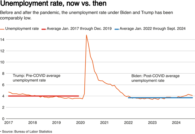 如果说新冠疫情的爆发是意外,对特朗普不太公平,那我们就把日历往前拨一年至2019年。但即便如此,2019年与2024年相比也是好坏参半。
