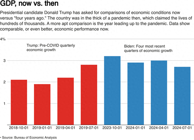 经通胀调整后,目前美国整体经济比2019年底增长11.5%,当时特朗普的产出达到了峰值。增长率具有可比性:从2023年第三季度到今年第三季度,经通胀调整后的产出增长了2.66%;用新冠疫情爆发前的可比数据,即从2018年Q3到2019年Q3,经济增长了2.8%。