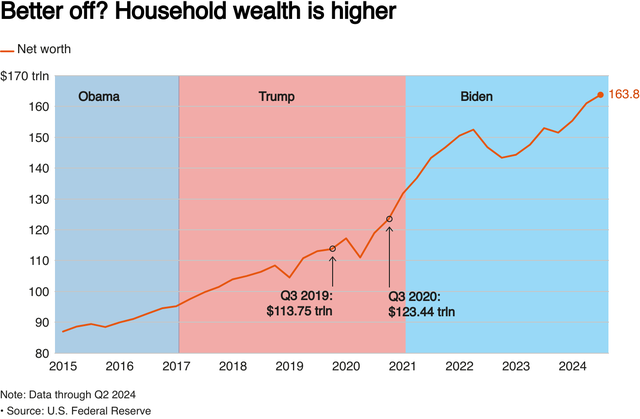 不是每个美国人都投资股票市场,也不是每个人都拥有住房。但对于部分人群来说,在新冠疫情后的几年里,拜登的确使家庭净资产稳步增加。