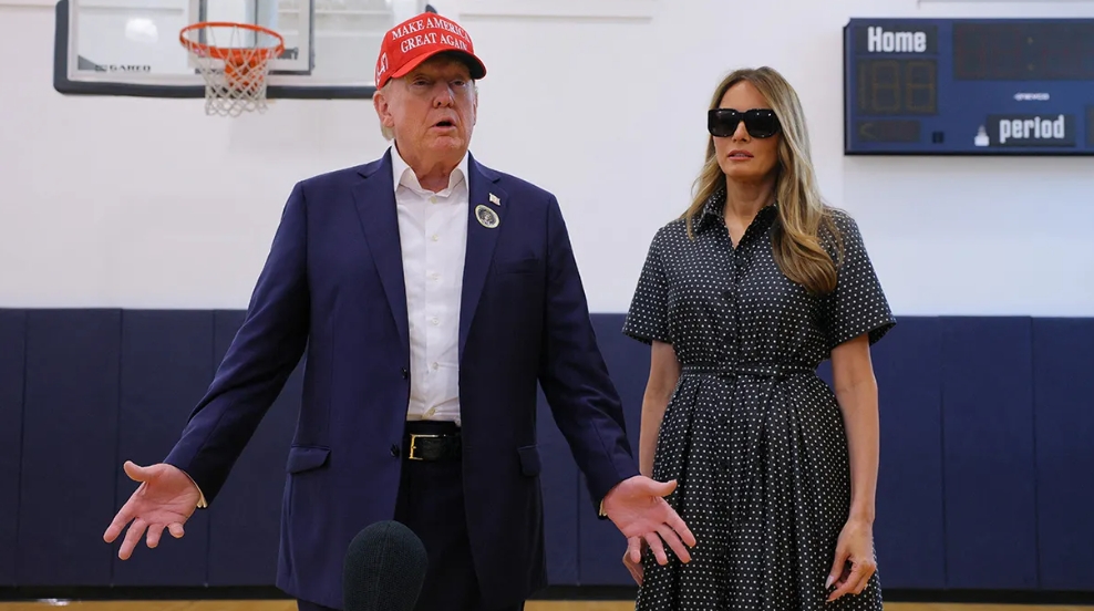 特朗普与梅拉尼亚现身佛罗里达州西棕榈滩的投票点,投完票后对记者们发表讲话。