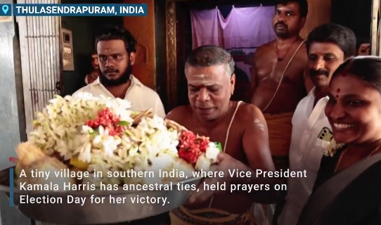 在印度南部的小村庄图拉森德拉普拉姆(Thulasendrapuram),当地村民在美国大选选举日为哈里斯举办祈祷仪式。据悉,这个村庄是哈里斯外祖父出生的地方。
