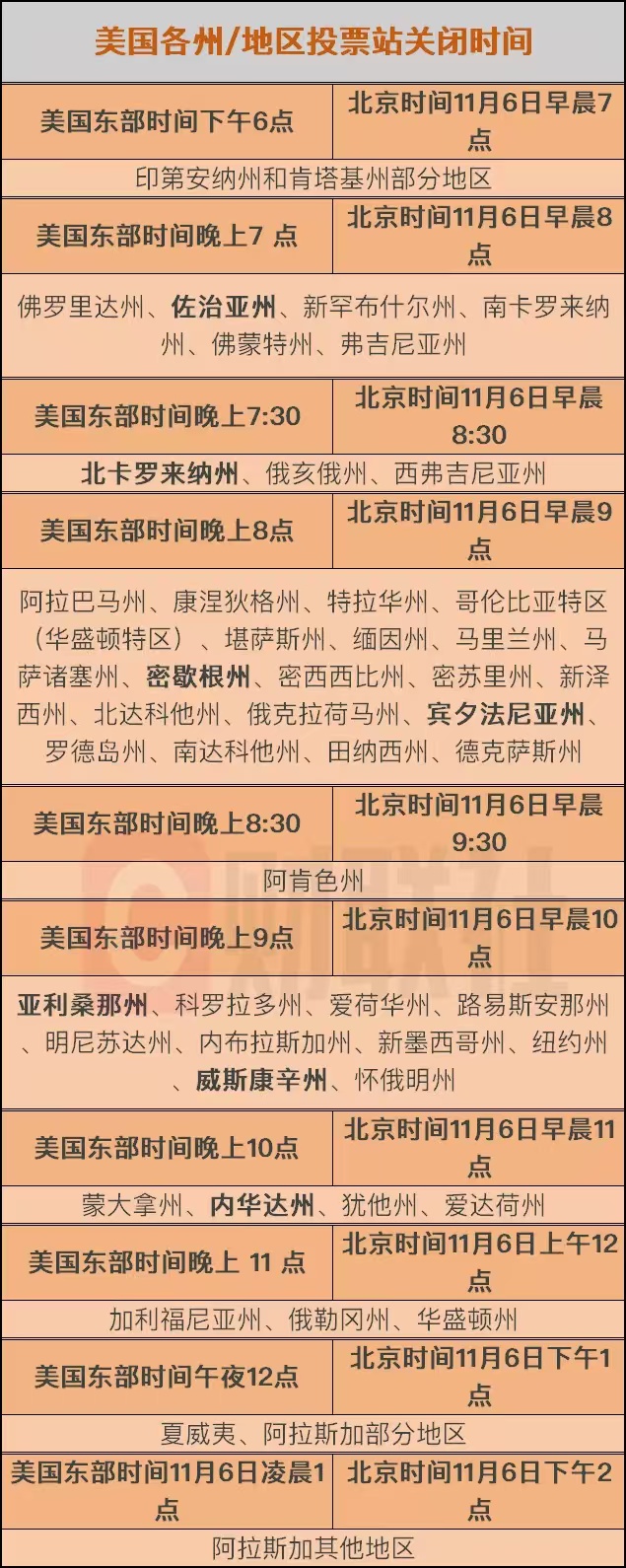 财联社此前在 《美国大选观战指南:关键州选情异常胶着最终选举结果何时能出炉?》 一文中统计称,最早从北京时间早上7点开始,第一批投票站才会关闭。以下是美国各州投票站关闭的时间点: