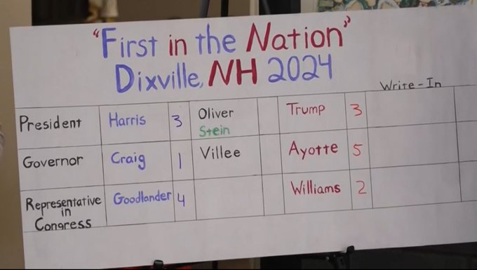 副总统哈里斯和前总统特朗普在新罕布什尔州小镇迪克斯维尔地方选区各获得三票,打成平局。