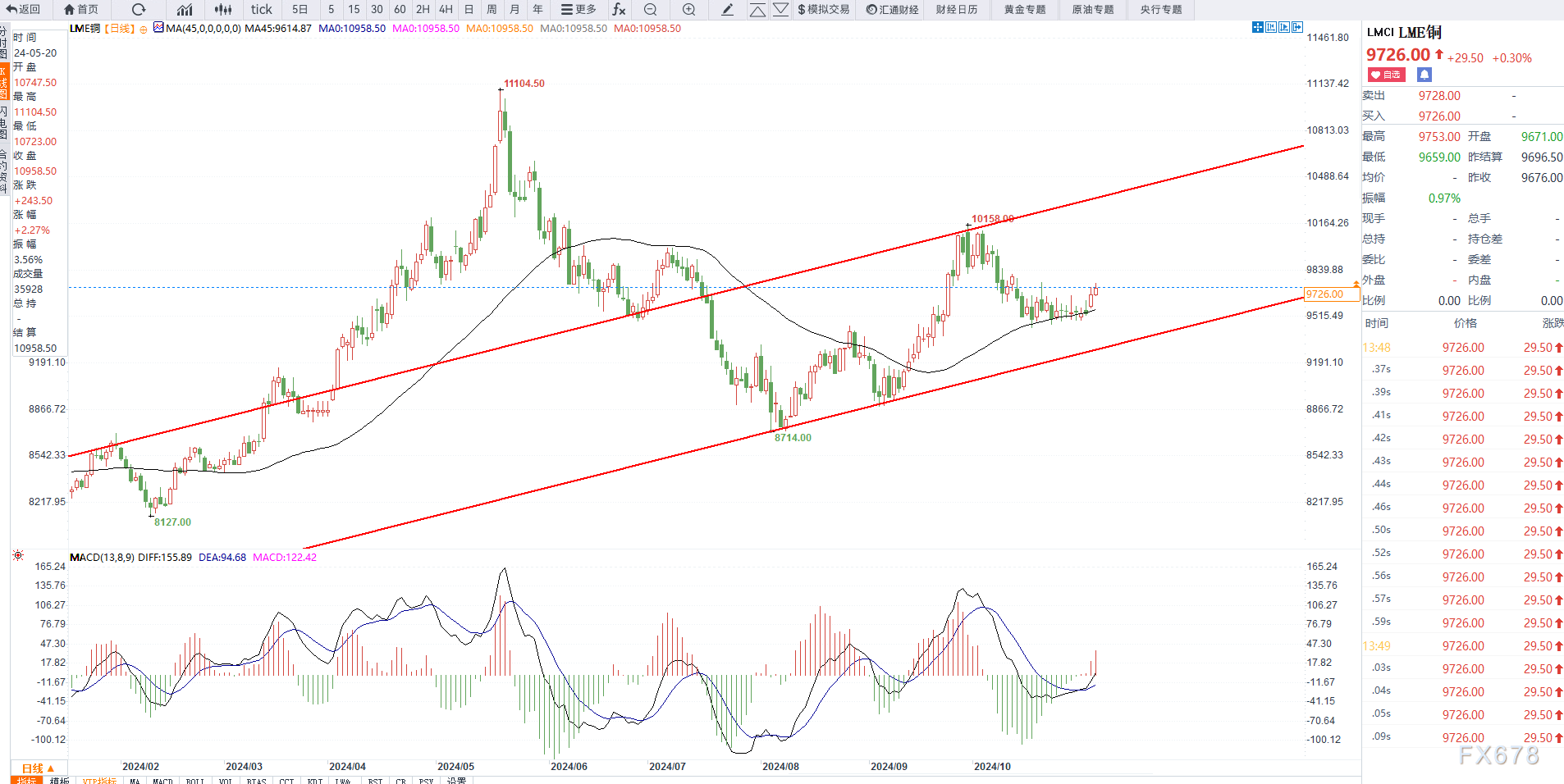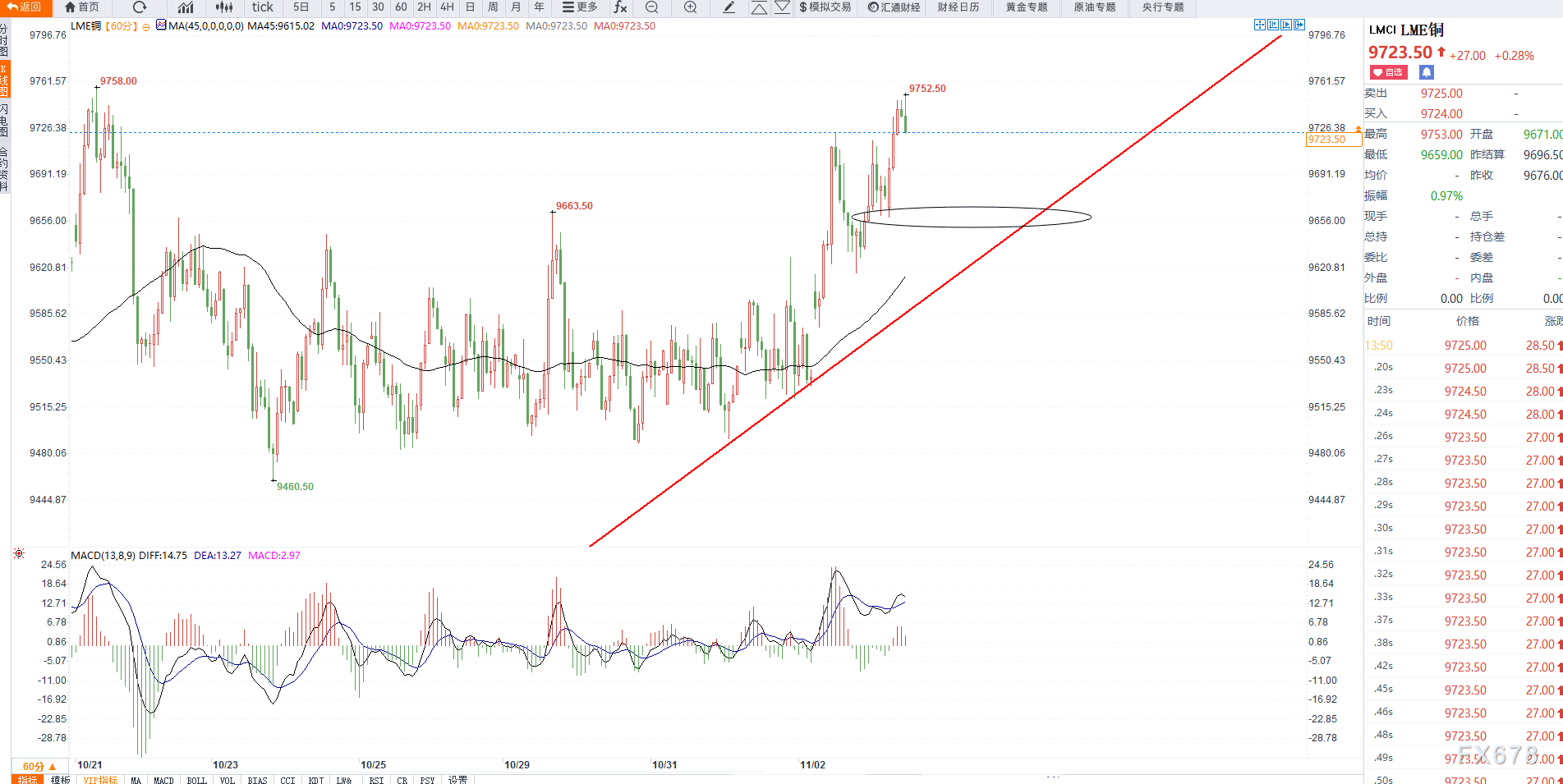 汇通网11月5日讯—— LME铜欧盘时段,交投于9730美元附近,自昨日低点9580美元附近如期出现反弹,昨日强调多头有望向上突破,目前日线已经站上均线支撑,有望挑战9800美元附近压力
