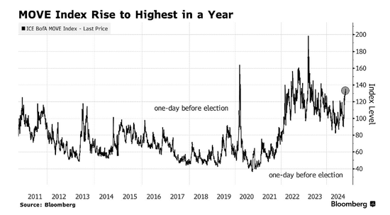 无论结果如何,有一件事是肯定的:28万亿美元美国国债市场的投资者都预计债券市场将爆发动荡。ICE BofA Move Index是债券市场的“恐惧指标”,其交易水平是2020年和2016年大选前几天的两倍。