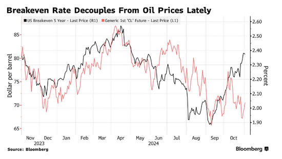 另一个需要关注的关键指标是所谓的盈亏平衡率,它衡量投资者的通胀预期。特朗普获胜被广泛认为会提振通胀。五年期盈亏平衡通胀率,即五年期通胀挂钩债券与美国国债的收益率差额,已经从9月初的不到1.9%上升至2.4%。