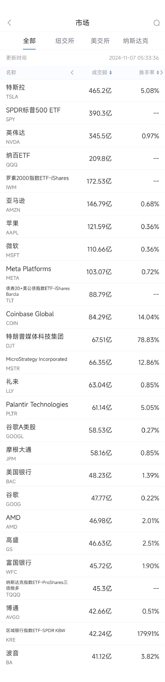 第8名特朗普媒体科技集团收高5.94%,成交67.51亿美元。特朗普胜选的消息推动该股大涨,周三早间该股一度上涨超过24%,但此后其涨幅迅速收窄,并因波动性停牌,恢复交易后其股价涨幅逐步回落。今年迄今该股仍下跌超过49%。