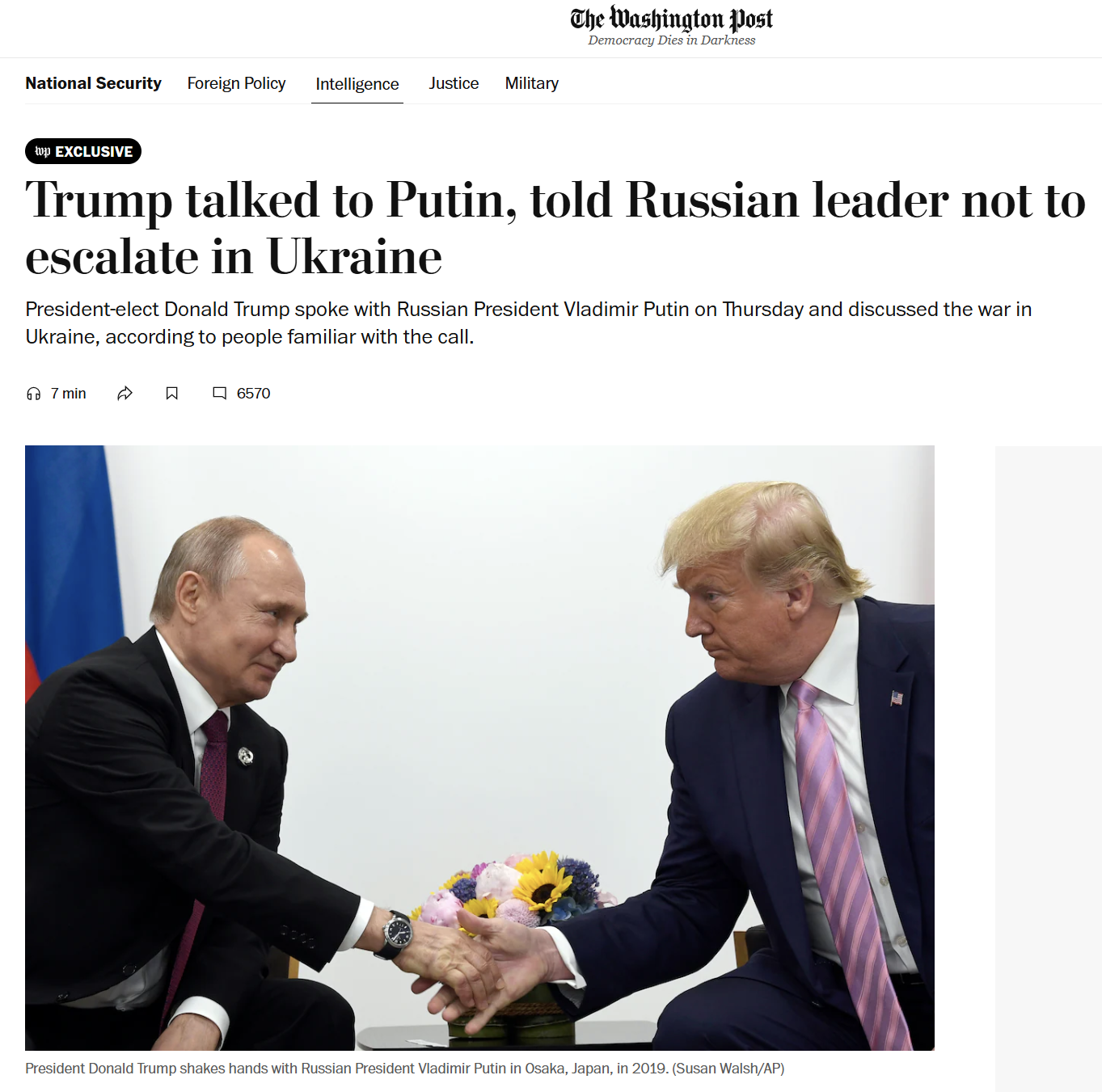 此前一天,《华盛顿邮报》援引知情人士的话报道称,特朗普上周四与普京进行了通话,讨论了俄乌冲突。这是特朗普赢得大选以来两人首次通话。