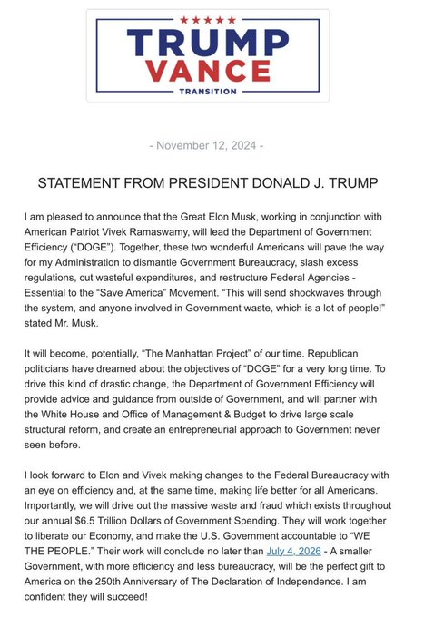 特朗普在上述声明中写道:“我期待着埃隆和维韦克对联邦官僚机构进行改革,着眼于效率,同时让所有美国人的生活更美好。重要的是,我们将消除存在于我们每年6.5万亿美元政府支出中的大规模浪费和欺诈。他们将共同努力解放我们的经济,让美国政府对‘我们人民’负责。”