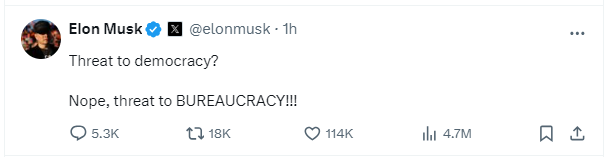 马斯克随后在社交媒体上发表了一系列回应这一声明的帖子。他在其中一篇帖子中表示:“对民主的威胁?不,这是对官僚主义的威胁!”