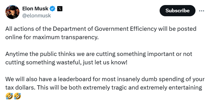 马斯克表示:“如果公众认为我们削减了重要开支或没有削减浪费的开支,请告诉我们……我们还将设立排行榜,评选出最愚蠢的税款支出,这将是极其悲惨的,同时极其有趣。”