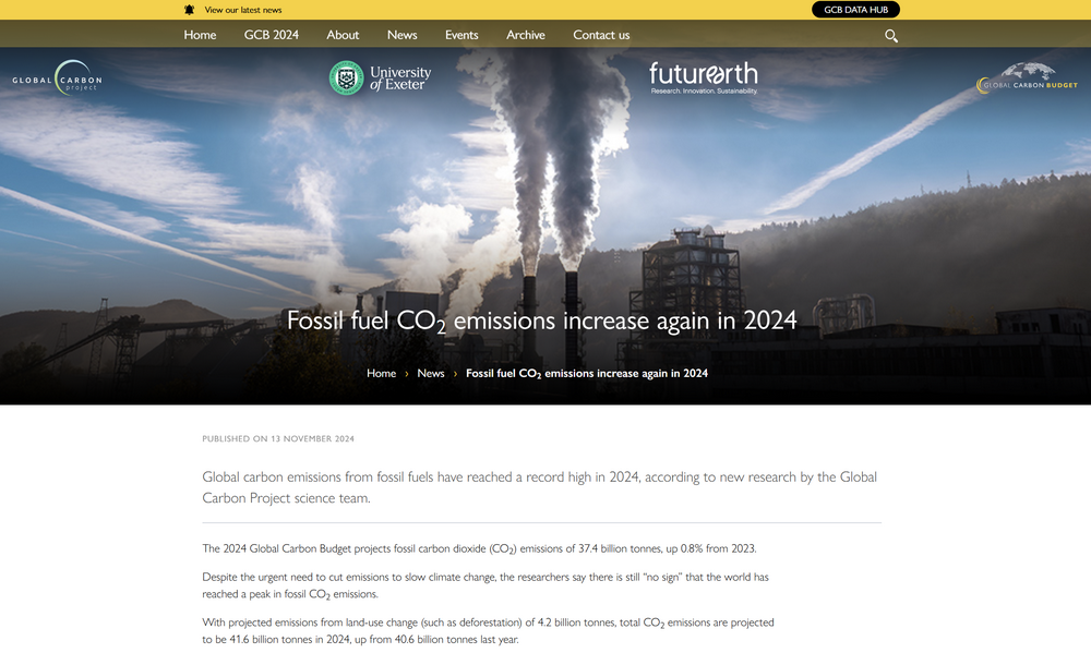 根据《全球碳预算》报告(Global Carbon Budget),2024年,全球二氧化碳排放量将达到416亿吨,高于去年的406亿吨。