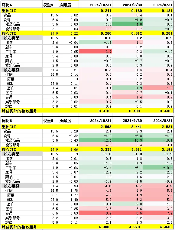 昨晚公布的10月美国CPI完全符合预期,整体CPI环比连续第四个月保持在0.2%,同比加速至2.6%。但其实这次环比四舍五入前的数字是0.24%,而之前两次都是0.18%,说明了去通胀最后一公里的艰难。
