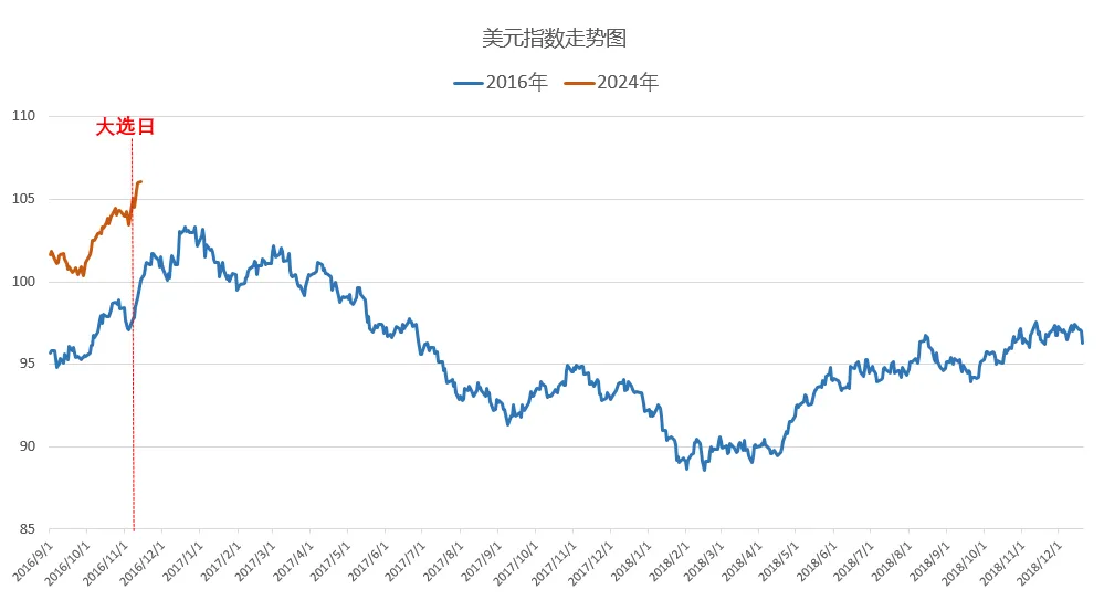 最后再分享两个图:1.对比2016年大选之后美元的走势,与现在竟惊人相似,拐点也许不久了?