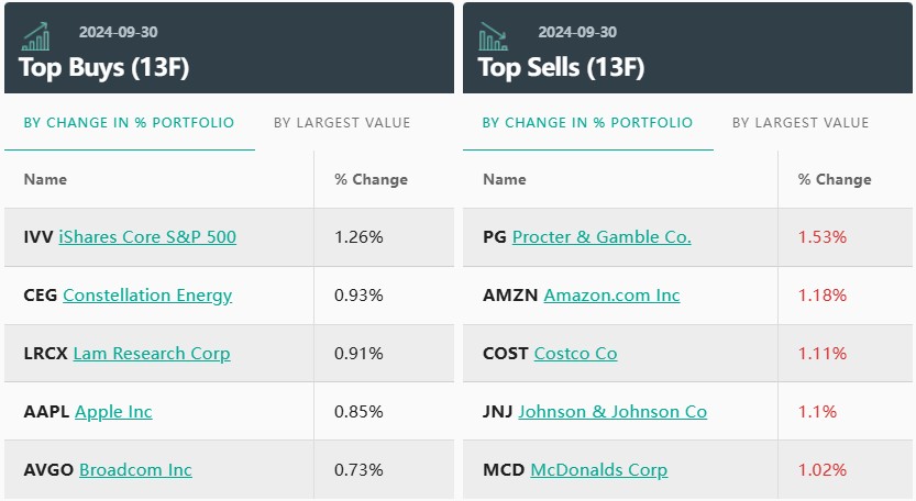前五大卖出标的包括:宝洁、亚马逊、好市多(COST.US)、强生(JNJ.US)、麦当劳(MCD.US)。