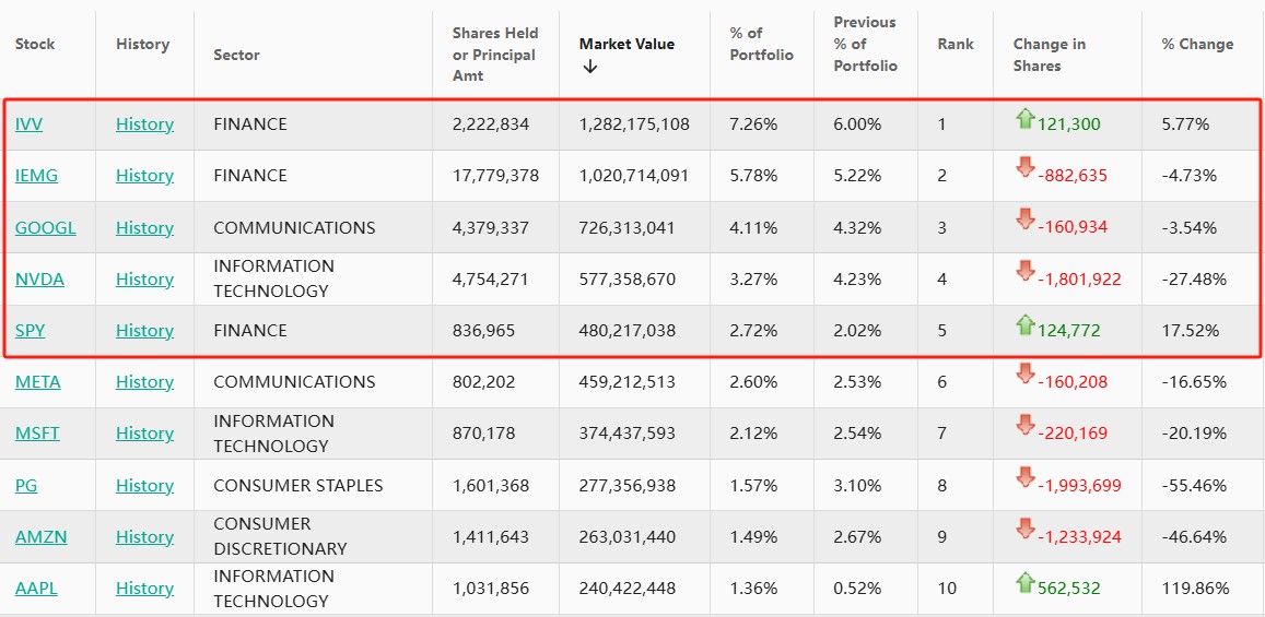 在前五大重仓股中,iShares标普500指数ETF(IVV.US)位列第一,持仓约222万股,持仓市值约为12.8亿美元,占投资组合比例为7.26%,较上季度持仓数量小幅增加5.77%。