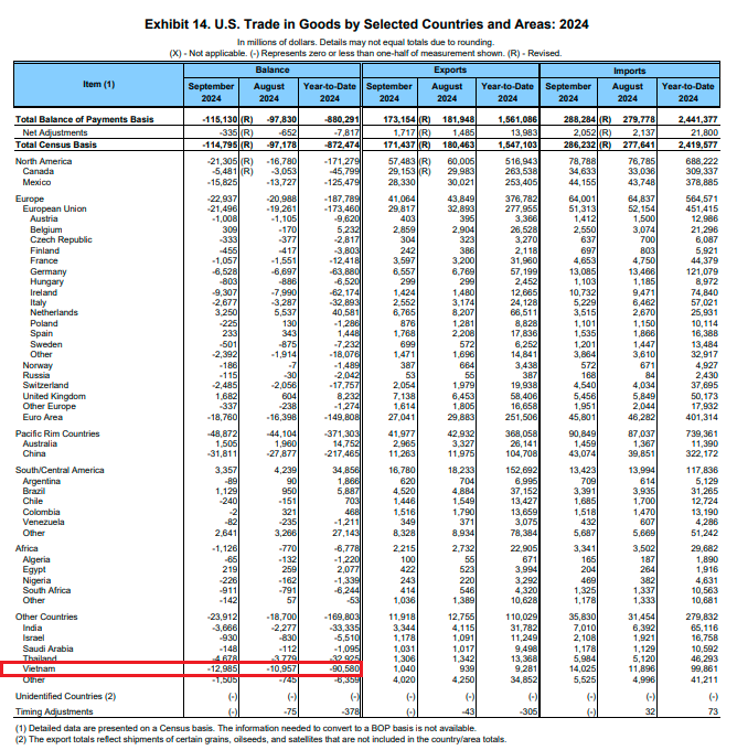 美国商务部的数据显示,越南目前已成为对美贸易顺差第四大的经济体,仅次于中国、墨西哥和欧盟。今年前九个月,越南对美国的贸易顺差已达到了逾900亿美元,逼近了去年全年的1040亿美元,同时也已几乎是2017年特朗普上任时(约380亿美元)的三倍。