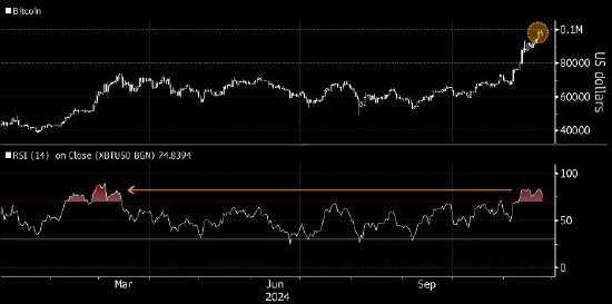Miller Tabak + Co首席市场策略师Matt Maley表示,投资者担心,比特币已经基本测试了10万美元的水平,将不得不稍事休息;并补充说,围绕比特币的看涨情绪正变得极端。特朗普即将上任的美国政府被视为有利于加密货币。自11月5日共和党获胜以来,数位资产市场的整体价值增加了约1万亿美元。