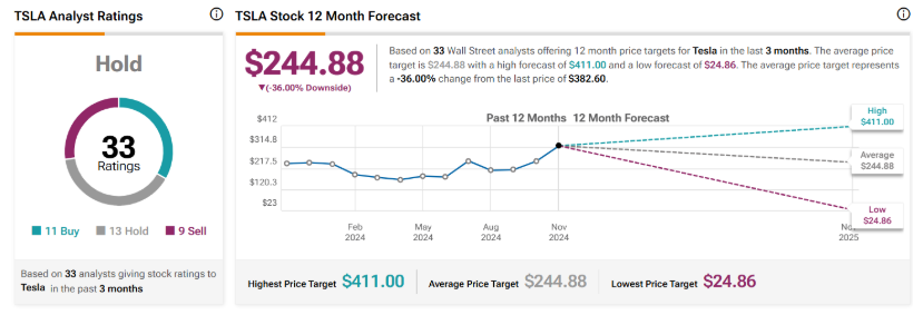 总体而言,分析师对特斯拉股票的一致评级为“持有”,基于过去三个月评级,共有11个“买入”、13个“持有”和9个“卖出”评级。特斯拉目前的平均目标价为每股244.88美元,这意味着有下行风险。