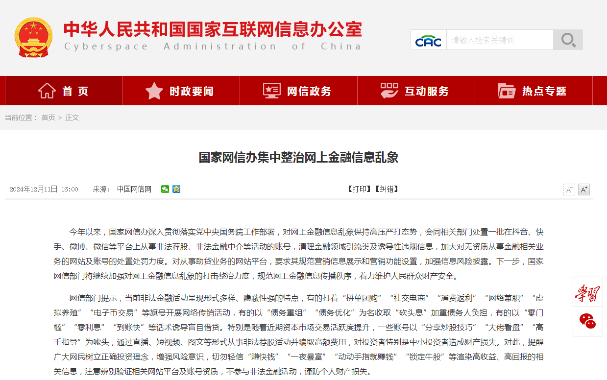 今年以来,国家网信办深入贯彻落实党中央国务院工作部署,对网上金融信息乱象保持高压严打态势,会同相关部门处置一批在抖音、快手、微博、微信等平台上从事非法荐股、非法金融中介等活动的账号,清理金融领域引流类及诱导性违规信息,加大对无资质从事金融相关业务的网站及账号的处置处罚力度。对从事助贷业务的网站平台,要求其规范营销信息展示和营销功能设置,加强信息风险披露。下一步,国家网信部门将继续加强对网上金融信息乱象的打击整治力度,规范网上金融信息传播秩序,着力维护人民群众财产安全。