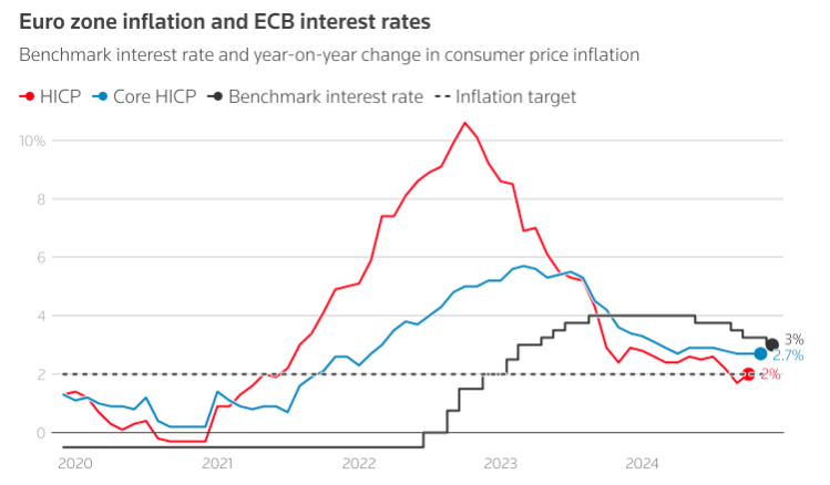 注:红线为CPI,黑线为基准利率欧洲央行:欧洲央行周四继续坚定地采取了宽松行动,将存款利率下调25个基点至3%,这是欧洲央行今年以来的第四次降息,并为进一步降息敞开大门。欧洲央行还取消了保持利率“足够限制性”的提法,这也表明进一步连续降息是有可能的。“足够限制性”是指会抑制经济增长的借贷成本水平。市场预计,到2025年底,欧洲央行将进一步降息约130个基点。