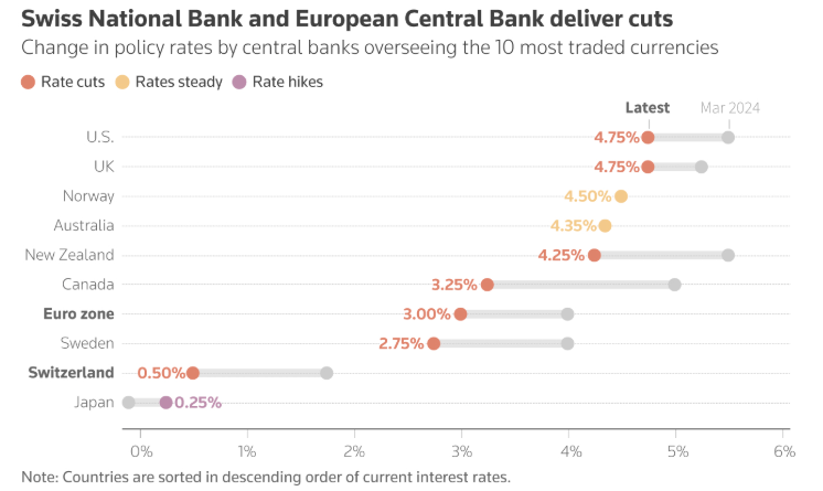 瑞士央行:一直走在货币宽松前沿的瑞士央行周四意外大幅降息50个基点至0.5%,这是自2022年11月以来的最低水平,也是该行近十年来的最大的降息幅度。瑞士近期公布的通胀率同比涨幅仅为0.7%,瑞士央行表示,明年可能再次降低借贷成本,该央行担心避险货币瑞郎的升值幅度,可能会超过国内出口商可以承受的水平。