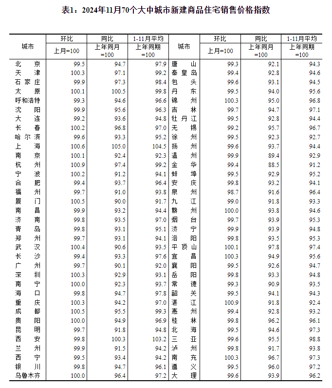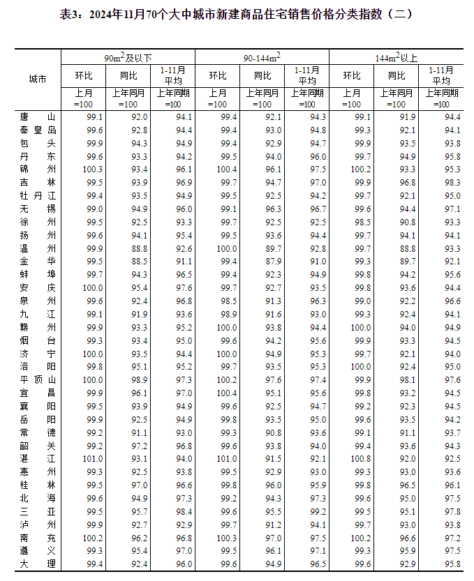 2024年11月份70个大中城市商品住宅销售价格变动情况