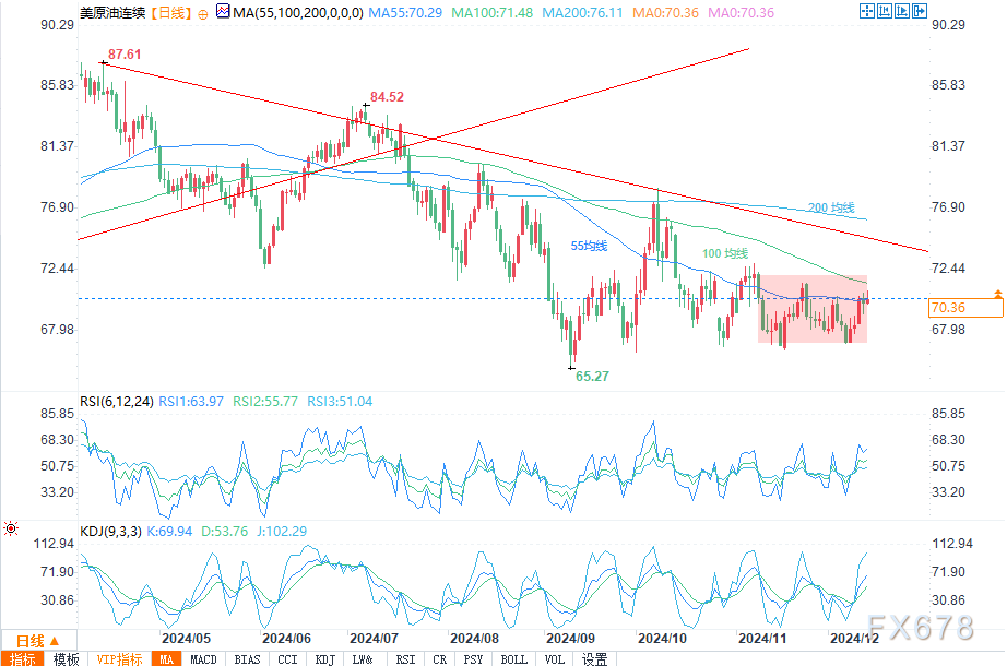 周五(12月13日)欧盘时段,WTI原油期货价格飙升,强势上破了50日移动均线,短期趋势看涨。北京时间22:03,WTI原油报70.36美元每桶,涨幅0.49%。