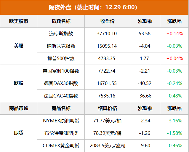 美股:标普500指数收涨1.77点,涨幅0.04%,报4783.35点。道指收涨53.58点,涨幅0.14%,报37710.10点。纳指收跌4.04点,跌幅0.03%,报15095.14点。