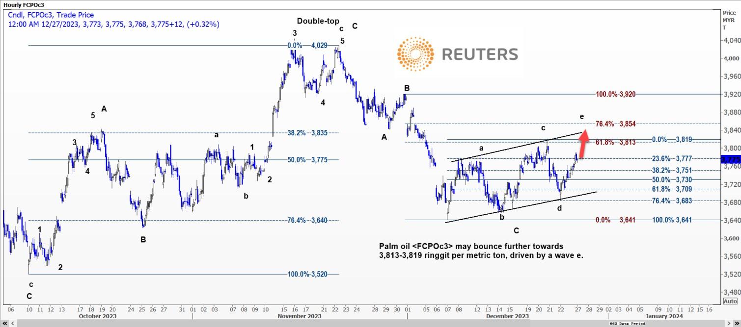 在e浪的推动下,棕榈油FCPOc3可能进一步反弹至每吨3813-3819林吉特的区间。