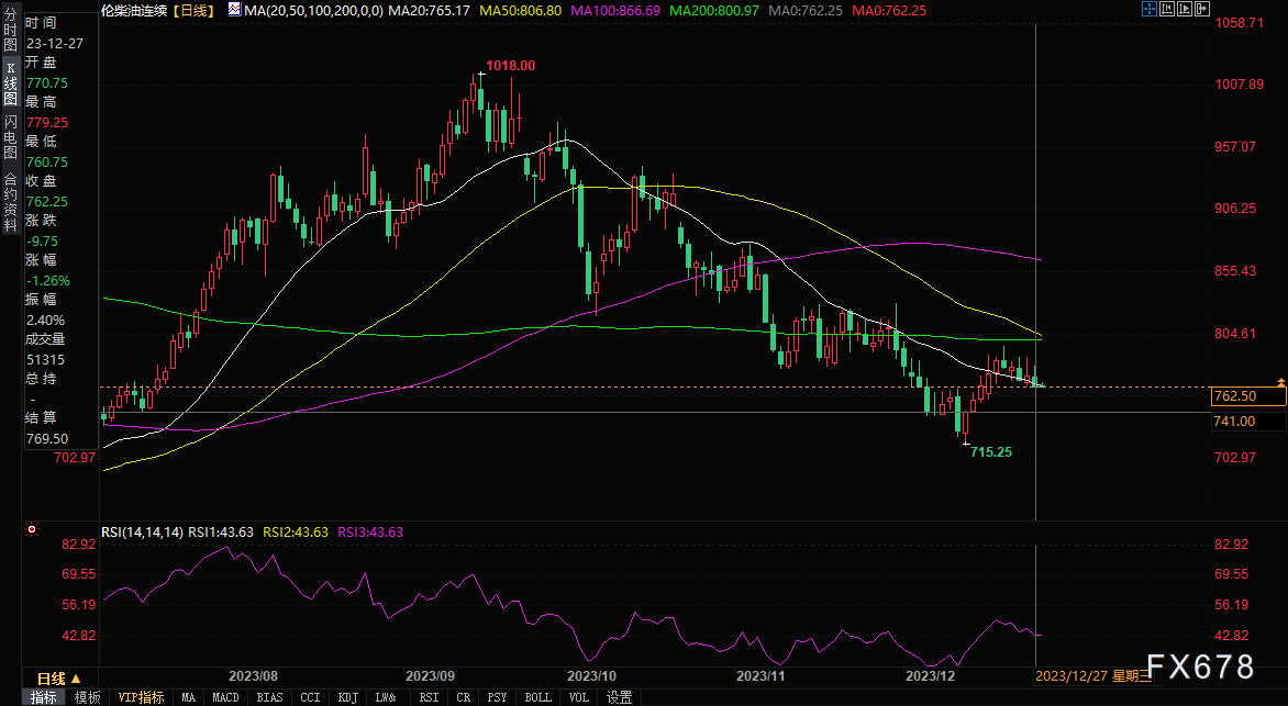 周四(12月28日),欧盘时段,伦敦柴油连续报762.50美元/每吨,跌0.91%。年初至今,伦敦柴油连续跌幅近20%。