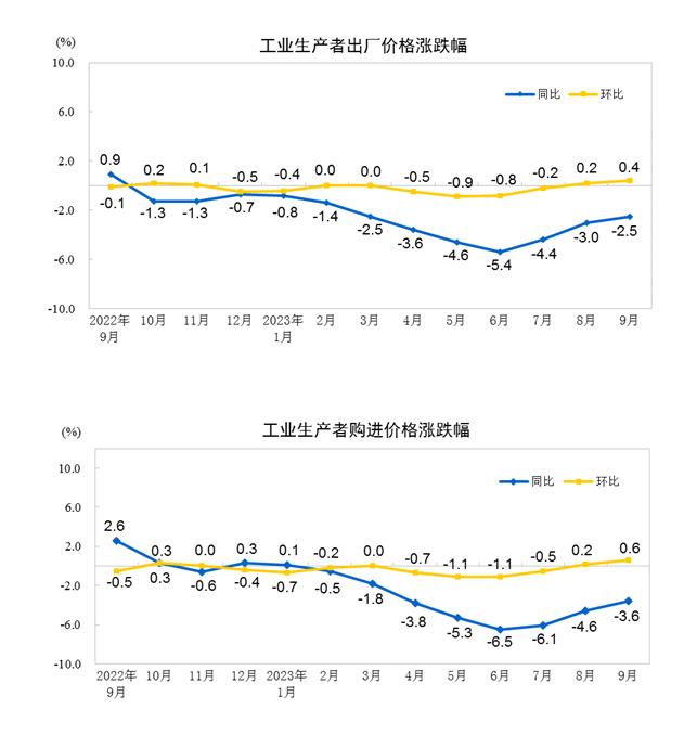 2023年9月份,全国工业生产者出厂价格同比下降2.5%,环比上涨0.4%;工业生产者购进价格同比下降3.6%,环比上涨0.6%。1—9月平均,工业生产者出厂价格比上年同期下降3.1%,工业生产者购进价格下降3.6%。