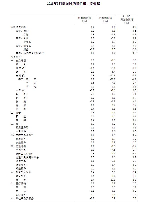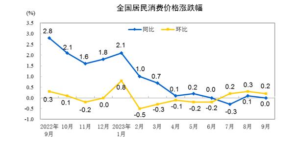 2023年9月份居民消费价格同比持平 环比上涨0.2%