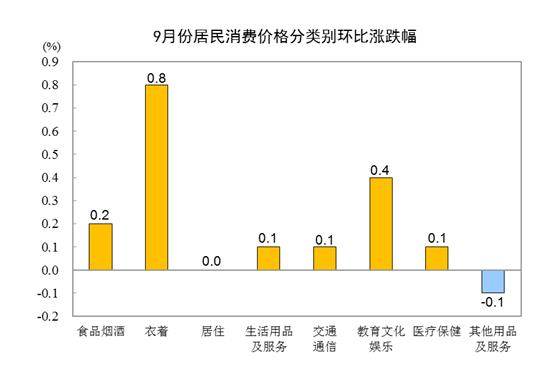 9月份,全国居民消费价格环比上涨0.2%。其中,城市上涨0.2%,农村上涨0.3%;食品价格上涨0.3%,非食品价格上涨0.2%;消费品价格上涨0.4%,服务价格下降0.1%。