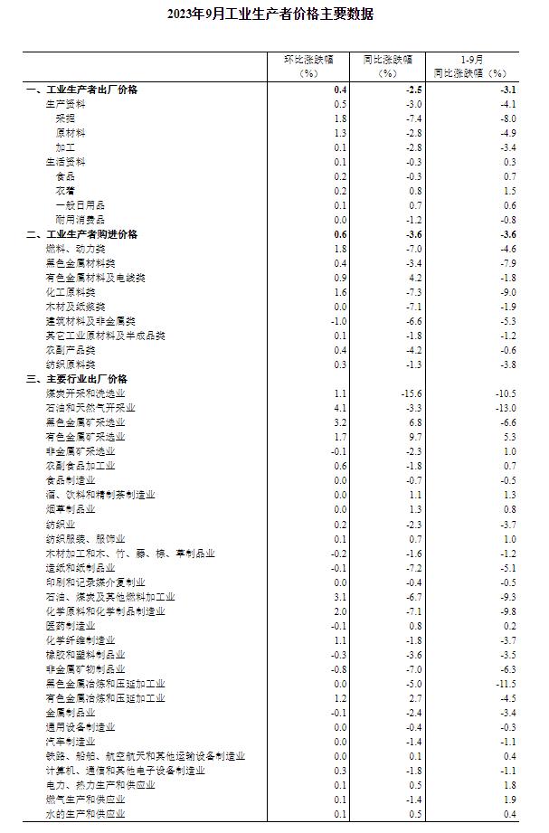2023年9月份工业生产者出厂价格同比下降2.5% 环比上涨0.4%
