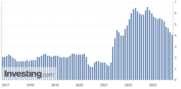 剔除燃料和食品等不稳定因素的核心CPI环比增长0.3%,同比涨幅为4.1%,均与预期一致,其中同比增幅为2021年10月以来新低,已连续6个月下降。