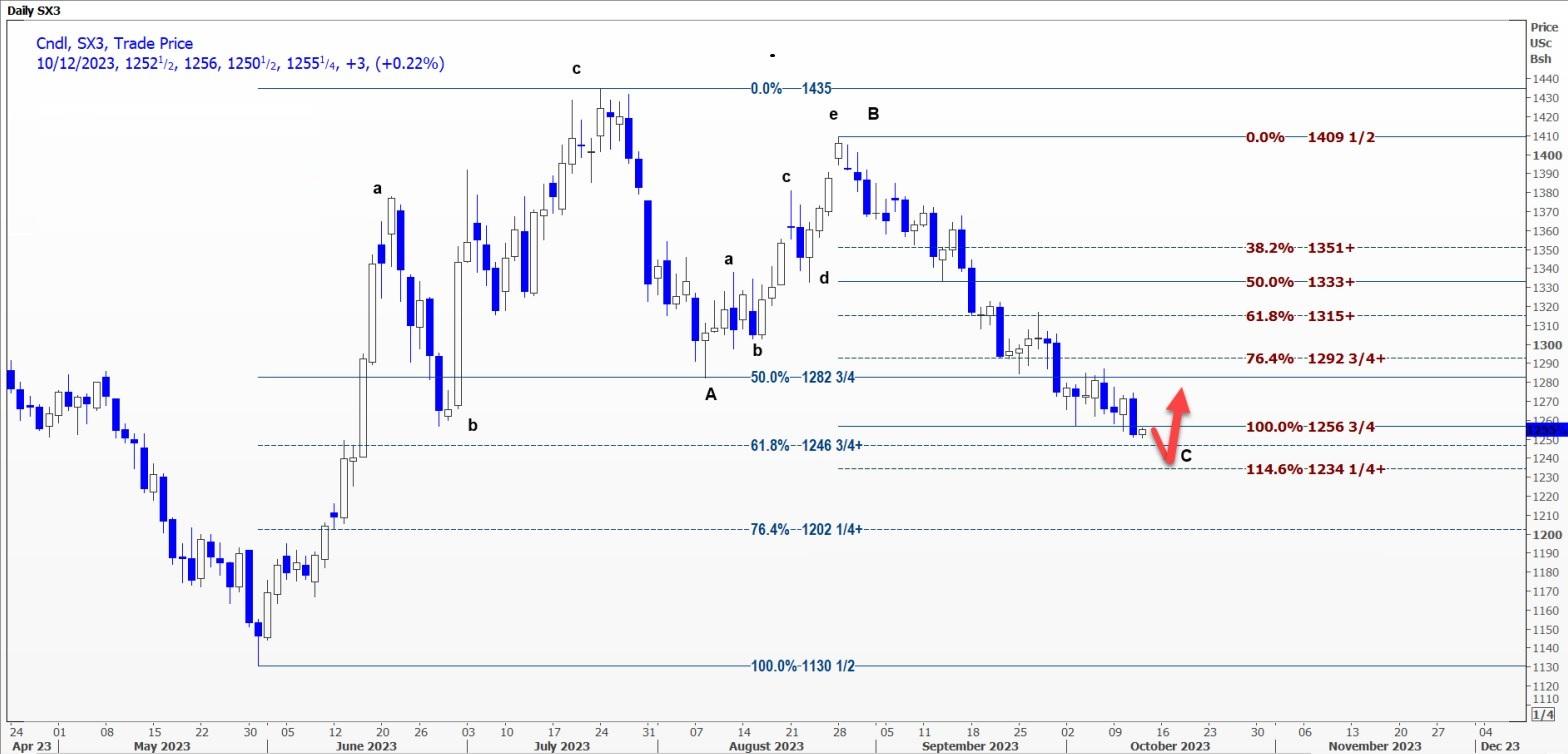 下降趋势正处于波浪(5)之上,该波浪一直在下降通道内行进。预测分析表明目标区域为1224美分/蒲式耳至1237.25美分/蒲式耳。