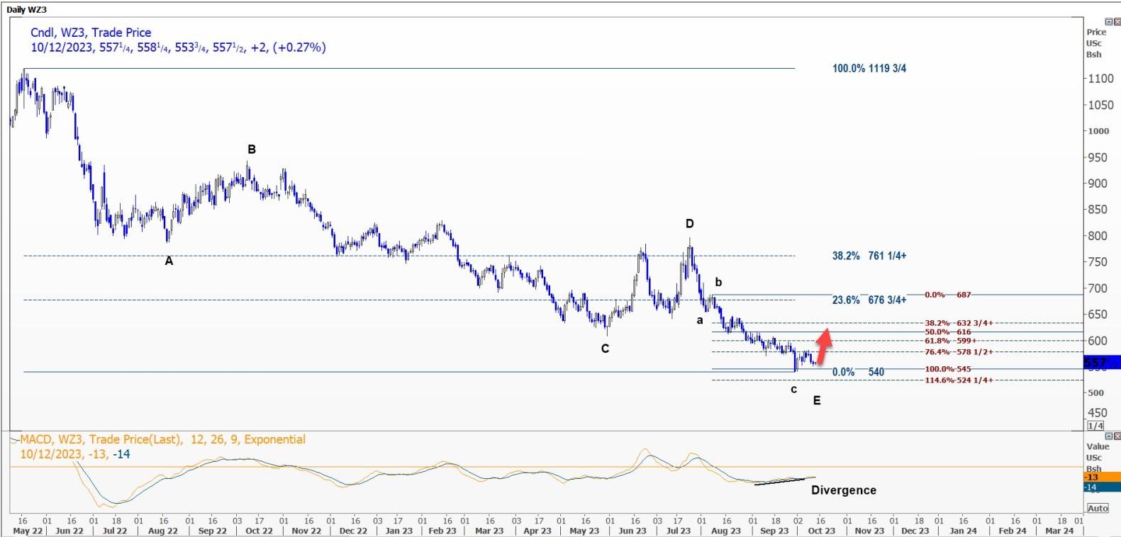 该分类基于从687美分/蒲式耳开始的c浪的完成以及每日MACD的看涨背离。