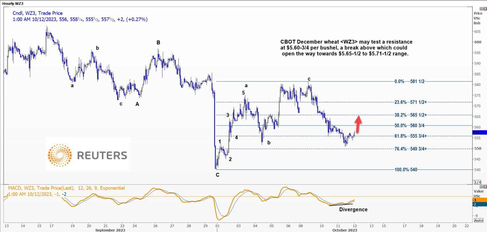 汇通网10月12日讯—— CBOT 12月小麦WZ3可能会测试560.75美分/蒲式耳的阻力位,突破该阻力位可能会打开通往56550美分/蒲式耳至571.50美分/蒲式耳区间的道路。