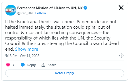 以色列预计上周在边境集结部队后将对加沙发动地面进攻。以色列国防军表示,“准备实施广泛的进攻行动计划”,其中包括对加沙哈马斯进行“从空中、海上和陆地进行综合协调的攻击”。 当地时间上周六(10月14日),据美国全国广播公司新闻翻译的一份声明称,以色列国防军补充说,它已经完成了数十万军人的反攻动员工作。 在迫在眉睫的地面行动之前,约110万巴勒斯坦人提前24小时接到通知,要求撤离加沙北部。该命令受到许多人道主义机构的严厉批评,因为在该时间内运送这么多人在后勤上是困难的。 现在这个最后期限已经过去了,而且还没有入侵的迹象。 以色列切断食品、燃油、水和电力供应后,加沙地带面临严重的人道主义危机。 人口稠密的地区遭到重创,以报复哈马斯上周末对以色列的残酷袭击。死亡人数继续上升。 伊朗警告:如果不阻止以色列,将产生“深远后果” 伊朗驻纽约联合国代表团在 X 网站上发布消息称,伊朗上周六警告说,如果以色列不立即停止“战争罪行和种族灭绝”,“局势可能会失控并引发深远的后果”。 帖子中写道:“如果以色列种族隔离的战争罪行和种族灭绝行为不立即停止,局势可能会失控并引发深远的后果——其责任在于联合国、安理会和各国引导安理会走向死胡同。”