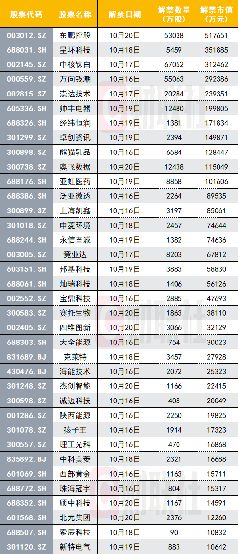 下周解禁市值360亿,东鹏控股解禁市值超50亿