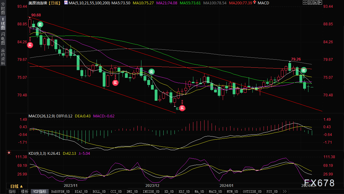 周二(2月6日)亚市早盘,美原油窄幅震荡,目前交投于72.68美元/桶。油价周一上涨约1美元,因市场担心中东地区的紧张局势和俄罗斯对乌克兰的战争持续可能抑制全球供应。 布伦特原油期货LCOc1结算价报每桶77.99美元,上涨0.66美元,涨幅0.9%;美国原油期货结算报每桶72.78美元,上涨0.5美元,涨幅0.7%。两大合约均为四个交易日以来首次上涨,但K线图显示短线仍有进一步下行风险,本交易日重点关注EIA原油市场月度报告和API原油库存系列数据。 交易商一直在密切关注中东局势,以色列和哈马斯之间的停火谈判似乎毫无进展,这表明这一产油区的紧张局势将持续下去。美国继续打击也门的胡塞武装。胡塞武装对航运船只的袭击令全球石油贸易航线受扰。 基辅的一位消息人士表示,两架乌克兰无人机上周六袭击了俄罗斯南部最大的炼油厂,这是对俄罗斯石油设施发动的一系列远程袭击中的最新一起,导致俄石化原料石脑油的出口减少。 Again Capital LLC合伙人John Kilduff说:“对俄罗斯石油供应设施的这些袭击开始造成影响。” 由于担心亚洲大国经济活动疲软和美国即将降息的希望减弱,油价在上周急挫7%。 周一的数据显示,1月美国服务业增长回升,这进一步打击了降息的希望,并推动美元触及近三个月来最高,这限制了油价涨幅。